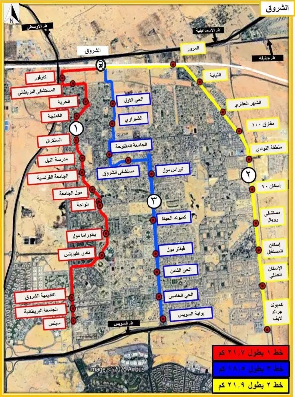 سيتم تشغيل عدد 18 ميني باص حديثًا ومكيفًا ، موزعين على ثلاثة مسارات تم تحديدها بالتنسيق مع جهاز مدينة الشروق وبخطة تشغيل تتوافق مع جداول تشغيل القطار الكهربائي الخفيف على أن تكون خطوط السير على النحو التالي :