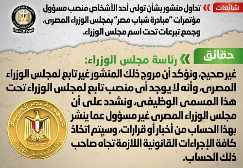 تداولت بعض المواقع الالكترونية وصفحات التواصل الاجتماعي منشور بشأن تولي أحد الأشخاص منصب مسؤول مؤتمرات “مبادرة شباب مصر” بمجلس الوزراء المصري، وجمع تبرعات تحت اسم مجلس الوزراء، وقد نفى مجلس الوزراء ذلك المنشور، مؤكداً أن مروج ذلك المنشور غير تابع لمجلس الوزراء المصري، وأنه لا يوجد أي منصب تابع لمجلس الوزراء تحت هذا المسمى الوظيفي، مُشدداً على أن مجلس الوزراء المصري غير مسؤول عما ينشر بهذا الحساب من أخبار أو قرارات، وسيتم اتخاذ كافة الإجراءات القانونية اللازمة تجاه صاحب ذلك الحساب.