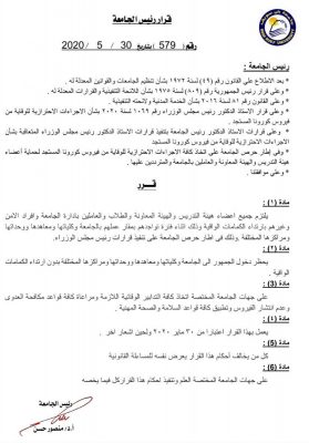 جهات الجامعة المختصة باتخاذ كافة التدابير الوقائية اللازمة ومراعاة كافة قواعد مكافحة العدوى وعدم انتشار الفيروس وتطبيق كافة قواعد السلامة والصحة المهنية.