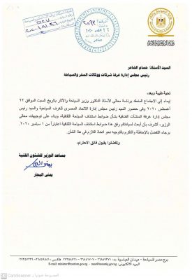 وقال الخطاب الذى أرسلته يمنى البحار ، مساعد وزير السياحة والآثار إلى حسام الشاعر رئيس غرفة شركات ووكالات السفر والسياحة والذى حصلت ” المحروسة نيوز” على نسخه منه بأهمية الإلتزام بكافة البنود التى تضمنتها الضوابط للحفاظ على أمن وصحة وسلامة المواطنين والسائحين للحد من إنتشار فيروس كورونا .