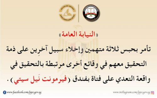 أمرت «النيابة العامة» بحبس ثلاثة متهمين أربعة أيام احتياطيًّا، وإخلاء سبيل ثلاثة آخرين إذا ما سدد كلٌّ منهم ضمانًا ماليًّا قدره مئة ألف جنيه، وآخر بضمان محلِّ إقامته، وذلك على ذمة التحقيق معهم في وقائع اتهموا فيها بمناسبة التحقيقات الجارية في واقعة التعدي على فتاة بفندق (فيرمونت نيل سيتي).