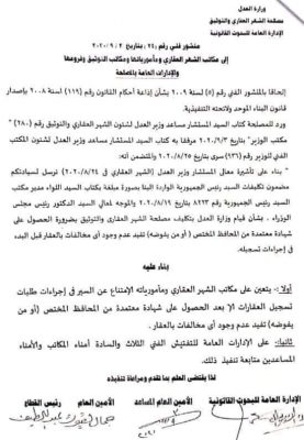 بالمستند |وزارة العدل تقرر: وقف إجراءات تسجيل المبانى المخالفة بالشهر العفارى إلا بعد شهادة من محافظ الأقليم يفيد بالمصالحة