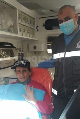الفنان على حميده فى سيارة الأسعاف خلال رحلة سفرة من مطروح للقاهرة لتلقى العلاج
