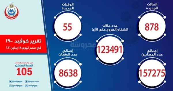وتواصل وزارة الصحة والسكان رفع استعداداتها بجميع محافظات الجمهورية، ومتابعة الموقف أولاً بأول بشأن فيروس “كورونا المستجد”، واتخاذ كافة الإجراءات الوقائية اللازمة ضد أي فيروسات أو أمراض معدية، كما قامت الوزارة بتخصيص عدد من وسائل التواصل لتلقي استفسارات المواطنين بشأن فيروس كورونا المستجد والأمراض المعدية، منها الخط الساخن “105”، و”15335″ ورقم الواتساب “01553105105”، بالإضافة إلى تطبيق “صحة مصر” المتاح على الهواتف ويمكن تحميله من خلال الرابطين التاليين: