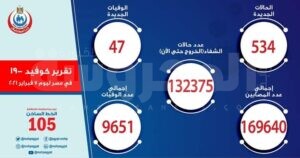 وأوضح الدكتور خالد مجاهد مستشار وزيرة الصحة والسكان لشئون الإعلام والمتحدث الرسمي للوزارة، أنه تم تسجيل 534 حالة جديدة ثبتت إيجابية تحاليلها معمليًا للفيروس، وذلك ضمن إجراءات الترصد والتقصي والفحوصات اللازمة التي تُجريها الوزارة وفقًا لإرشادات منظمة الصحة العالمية، لافتًا إلى وفاة 47 حالة جديدة.