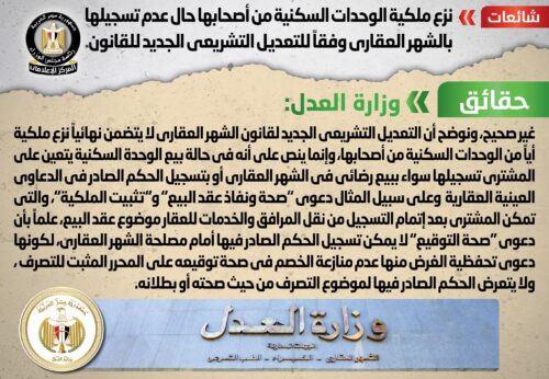 وقد قام المركز الإعلامى لمجلس الوزراء بالتواصل مع وزارة العدل، والتى نفت تلك الأنباء، مُؤكدةً أنه لا صحة لنزع ملكية الوحدات السكنية من أصحابها حال عدم تسجيلها بالشهر العقارى وفقاً للتعديل التشريعى الجديد للقانون، مُوضحةً أن التعديل التشريعى الجديد لقانون الشهر العقارى لا يتضمن نهائياً نزع ملكية أياً من الوحدات السكنية من أصحابها.