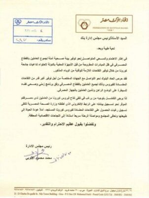 وطالب اتحاد البنوك في منشوره، من البنوك، بتسجيل بيانات العاملين الراغبين في تلقي لقاح فيروس كورونا، عبر الرابط الإلكتروني الذي أطلقته وزارة الصحة المصرية لتلقي تسجيل رغبات الحصول على اللقاحات المضادة لفيروس كورونا المستجد.