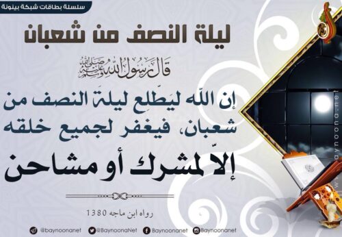 كما يشدد على كل مسلم أن يستقبل تلك الليلة بنوايا صافية وقلب خالي من الحقد والمشاحنات، حيث يقبل الله كل الأعمال من عباده ماعدا المشاحنين، وورد في ذلك عن معاذ بن جبل رضي الله عنه عن النبي صلى الله عليه وآله وسلم قال: “يَطَّلِعُ الله إِلَى خَلْقِهِ فِي لَيْلَة النِّصْفِ مِنْ شَعْبَانَ فَيَغْفِرُ لِجَمِيعِ خَلْقِهِ إِلا لِمُشْرِكٍ أَوْ مُشَاحِنٍ” رواه الطبراني.