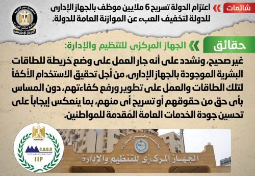 وقام المركز الإعلامي لمجلس الوزراء بالتواصل مع الجهاز المركزي للتنظيم والإدارة، والذي نفى تلك الأنباء، مؤكداً أنه لا توجد نية لتسريح أيٍ من موظفي الجهاز الإداري للدولة، وفقاً لبيان صادر اليوم الاثنين.