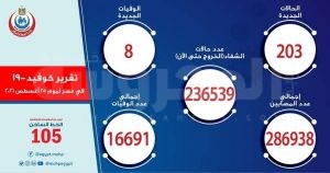 وأوضح الدكتور خالد مجاهد مساعد وزيرة الصحة والسكان للإعلام والتوعية، والمتحدث الرسمي للوزارة، أنه تم تسجيل 203 حالات جديدة ثبتت إيجابية تحاليلها معمليًا للفيروس، وذلك ضمن إجراءات الترصد والتقصي والفحوصات اللازمة التي تُجريها الوزارة وفقًا لإرشادات منظمة الصحة العالمية، لافتًا إلى وفاة 8 حالات جديدة.