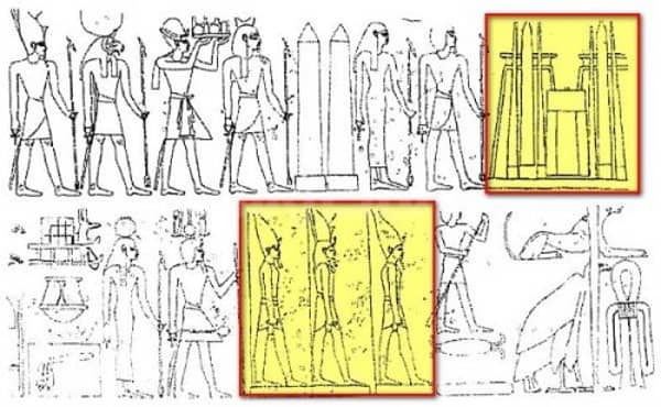 ذكر معها تصويراً التماثيل نصاً بالكلمة (ẖntyw) وتصويراً بأشكالهم كما كانوا أمام صرح المعبد دون وجود أي تمثال أوزيري إطلاقاً أمام الصرح الخارجي للمعبد