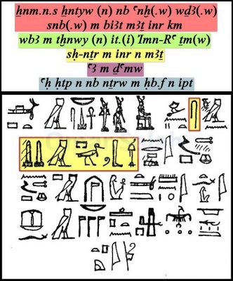 bḫnt [pẖr.ty m] tḫnwy n ỉt.f Imn-Rˁ-tm(w) [pẖr.ty m] ẖntyw n nb [ˁnḫ(.w) wḏȝ(.w) snb(.w)] m bỉȝt mȝṯ