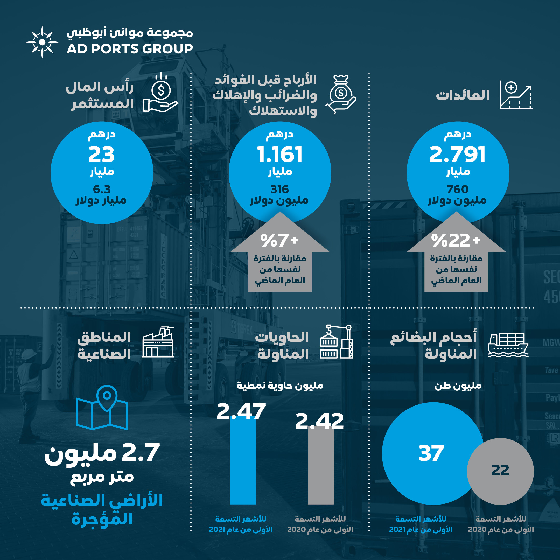 أعلنت مجموعة موانئ أبوظبي اليوم عن النتائج المالية للأشهر التسعة الأولى المنتهية في 30 سبتمبر 2021 حيث سجلت معدل نمو في العائدات بلغ 22% مقارنة بالفترة نفسها من العام الماضي لتصل إلى 2.791 مليار درهم- ما يعادل 760 مليون دولار، في زيادة عن الرقم المسجل خلال الأشهر التسعة الأولى من عام 2020 والبالغ 2.295 مليار درهم – ما يعادل 625 مليون دولار، ويعود هذا الارتفاع إلى الزيادة في أحجام المناولة، والتنويع في قطاعات أعمال جديدة، وإبرام شراكات جديدة.