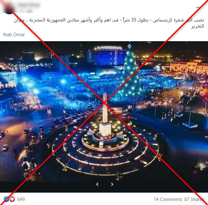 انتشرت على مواقع التواصل الاجتماعي، خصوصاً في مصر، صورة يدّعي ناشروها أنّها تظهر “تزيين ميدان التحرير في القاهرة بشجرة ميلاديّة ضخمة”. إلا أنّ الصورة مركّبة.