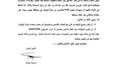 السياحة: مسحة جديدة بالمطار حال الشك في تحليل فيروس كورونا للوافدين من أوكرانيا