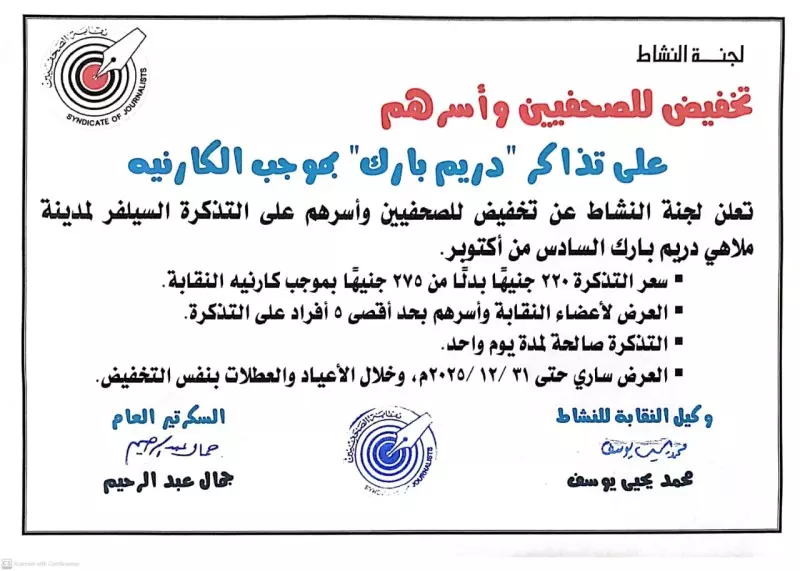 تخفيض للصحفيين وأسرهم على تذاكر “دريم بارك” بموجب الكارنيه