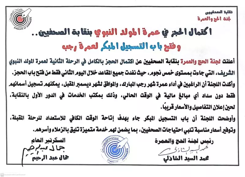 اكتمال الحجز في عمرة المولد النبوي بنقابة الصحفيين.. وفتح باب التسجيل المبكر لعمرة رجب