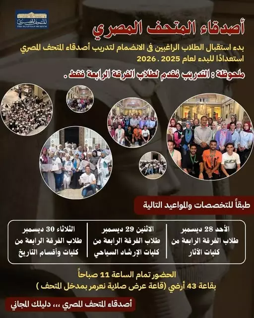 بدء استقبال طلبات الالتحاق بتدريب «أصدقاء المتحف المصري» لطلاب الفرقة الرابعة بأقسام الإرشاد السياحى بكليات ومعاهد السياحة والفنادق والآثار وأقسام التاريخ