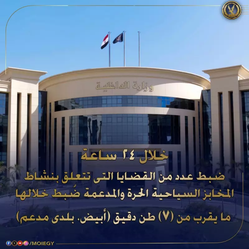الداخلية تضبط مخالفات بـ47 مليون جنيه.. 7 أطنان دقيق مدعم.. ورشة لتصنيع الأسلحة البيضاء.. وتوقف صانع محتوى خادش للحياء