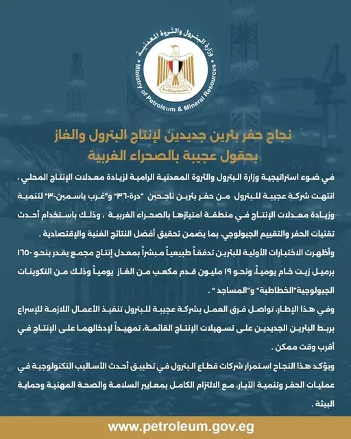 نجاح حفر بئرين جديدتين لإنتاج البترول والغاز بحقول عجيبة بالصحراء الغربية