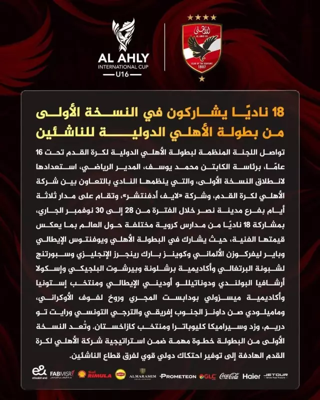 18 ناديًا عالميًا يشاركون في النسخة الأولى من بطولة الأهلي الدولية للناشئين تحت 16 سنة