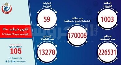 تسجيل 1003حالات إيجابية جديدة بفيروس كورونا و59 حالة وفاة